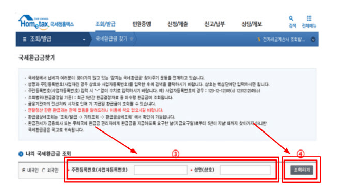 사업자등록 번호나 주민 등록 번호를 입력하시고 성명을 입력하시고 미환급금 유무를 확인해주세요.